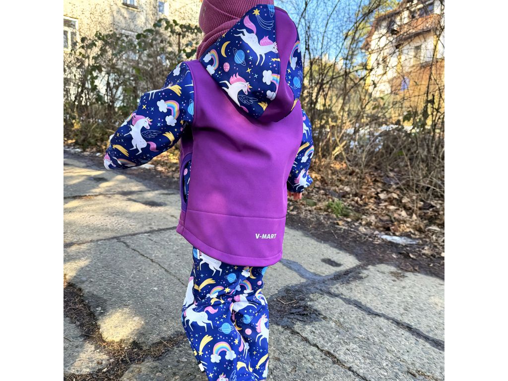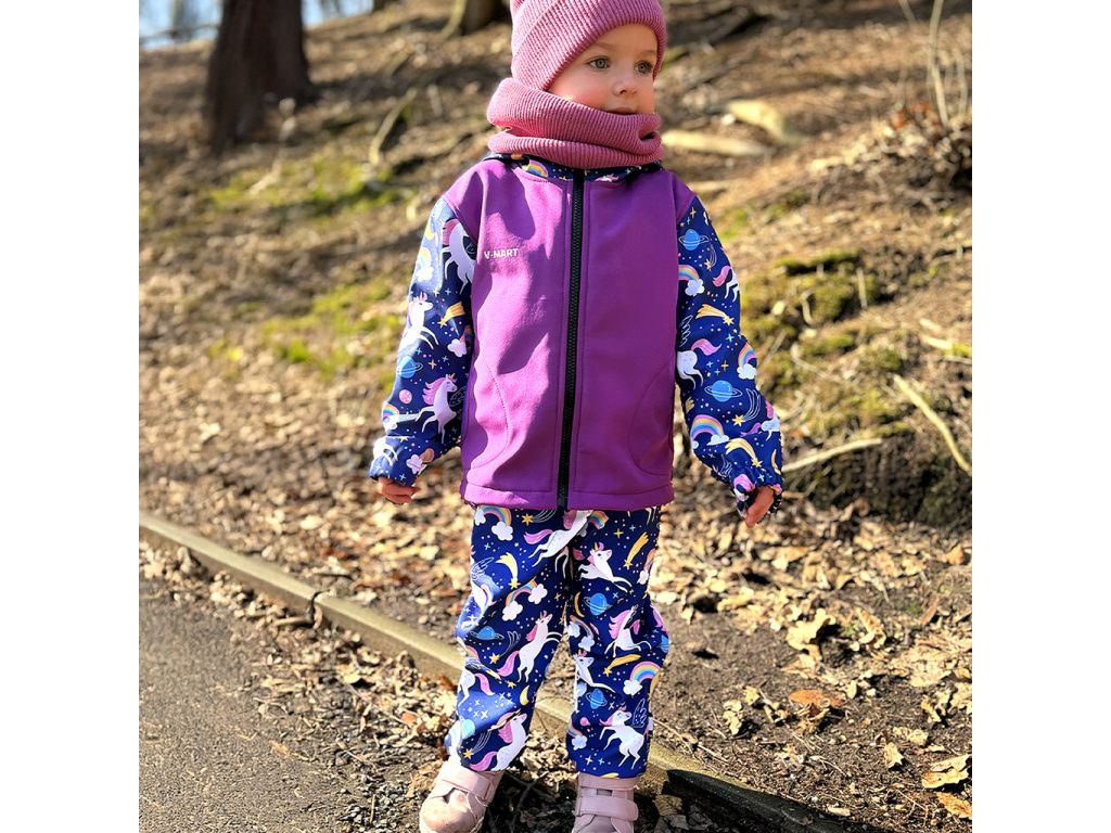 Dívčí letní softshellové kalhoty s potiskem jednorožců na fialovém podkladu. Náplety (lemování kapes, pas, ukončení nohavic) jsou v tmavě fialové barvě.