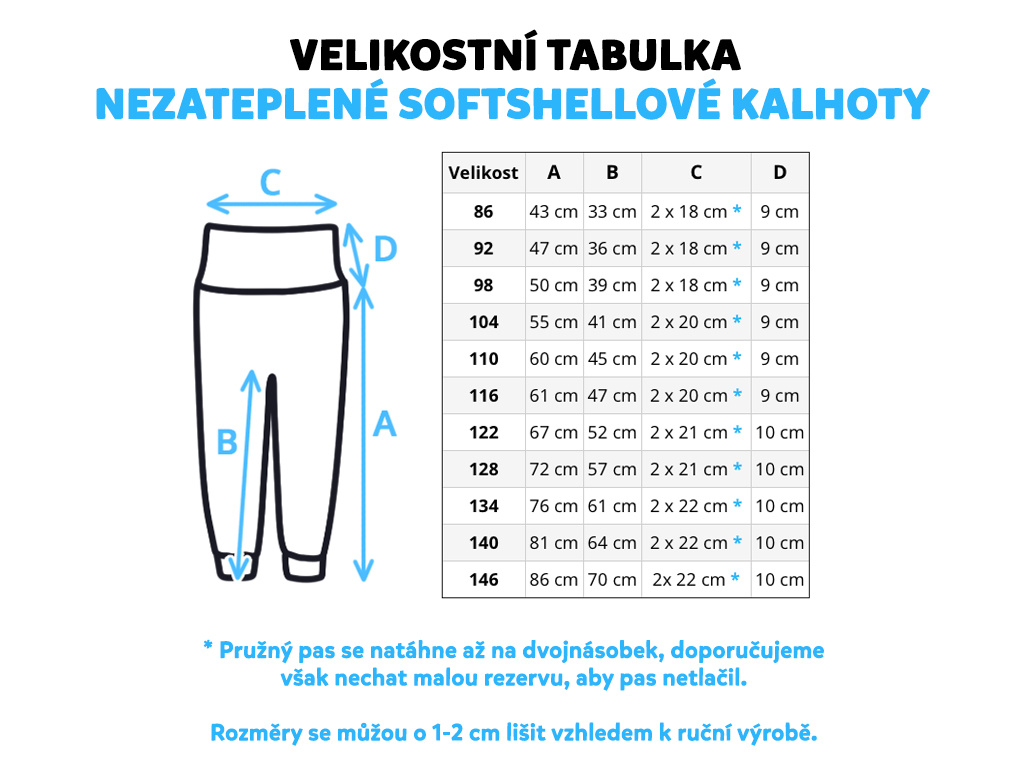 Materiál, který je ideální k venkovnímu dobrodružství. Nepromokne, neprofoukne, a proto je mezi maminkami a jejich dětmi tolik oblíbený. Skládá se ze tří vrstev - vrchní vrstvy, prodyšné membrány a vnitřní síťky, která je k látce přilepená. Vodní sloupec softshellu je 18 000 mm, prodyšnost 12 000 g/m2/24 hod. Tyto parametry jsou ideální na běžné volnočasové aktivity, jako je výlet do přírody, odpolední procházka nebo hraní na hřišti. Kalhoty jsou ušité z pružného softshellu.