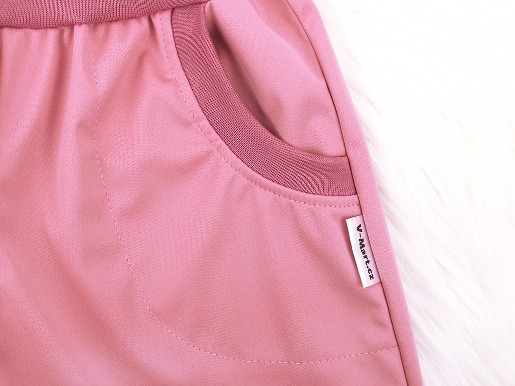 Pozor! Tento softshell je nejslabší ze všech, je pružný do stran, lesklejší, měkčí než ostatní letní softshelly. Materiál lehce připomíná sportovní teplákovinu. Letní softshellové kalhoty jsou lehounké, nahradí šusťákové kalhoty. Z rubu mají starorůžové kostičky. Softshellky jsou nepromokavé, neprofouknou a ještě udělají spoustu parády. Hodí se zejména do deštiva, mokra a chladnějšího počasí, jsou určeny na venkovní nošení. Jsou slabounké a nemají zateplení. Softky mají volnější střih s kapsami, v nohavicích i v pase je náplet. Náplet v pase je vyšší, z rubu má dírku na protažení gumy. Dá se nosit i ohrnutý, je velmi pružný.