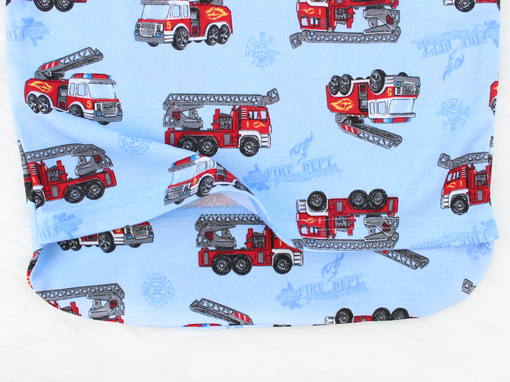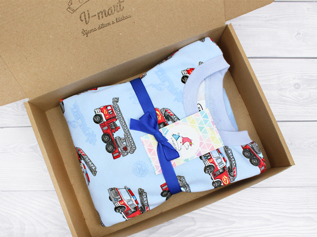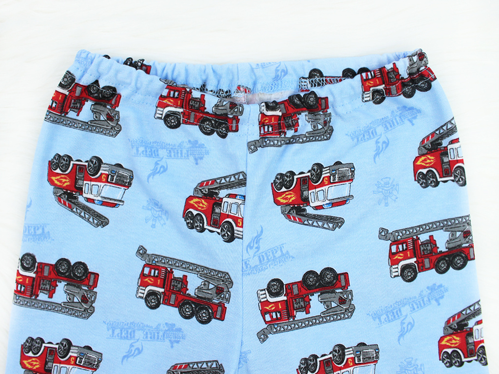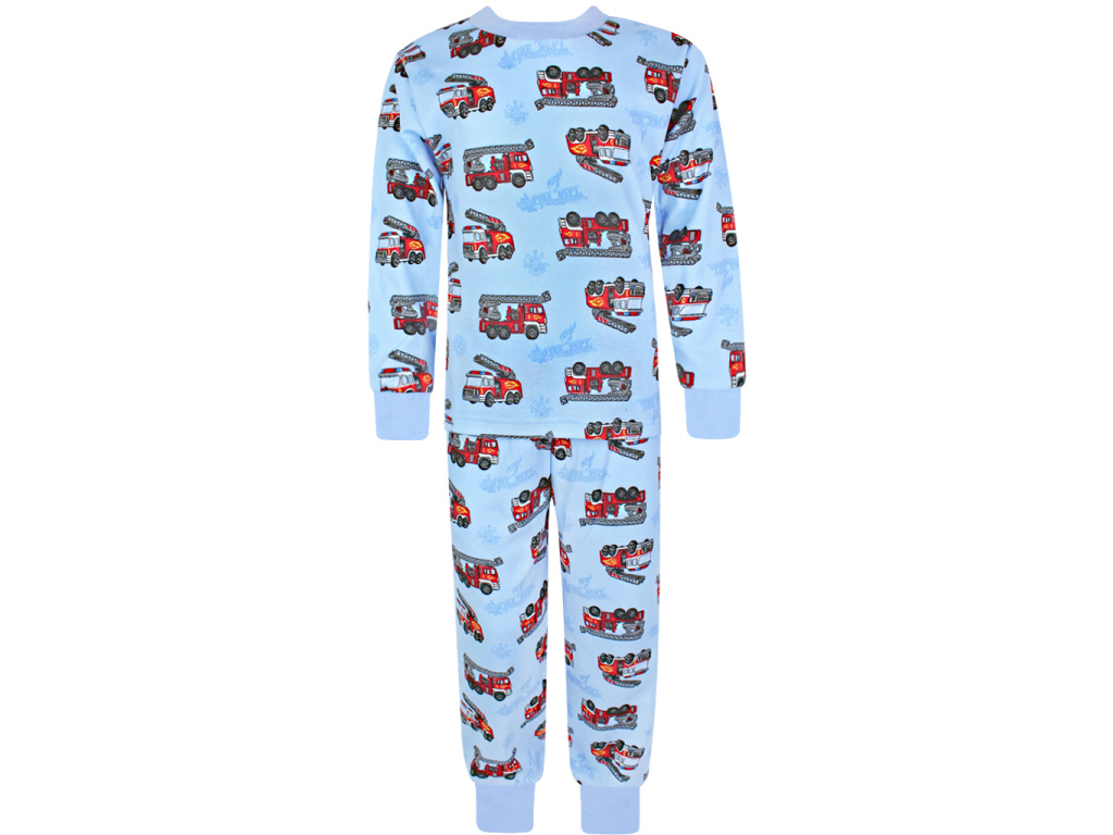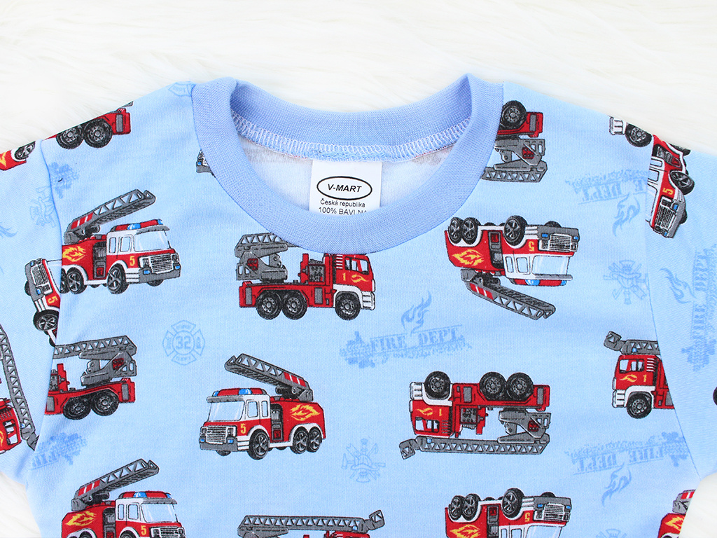 Bavlněné chlapecké pyžamo se vzorem hasičských aut na světle modrém podkladu je doplněno světle modrým nápletem (95% bavlna, 5% elastan) u krku a jako zakončení rukávů a nohavic. Pyžamko je ušito z příjemného 100% bavlněného oboulícního úpletu.