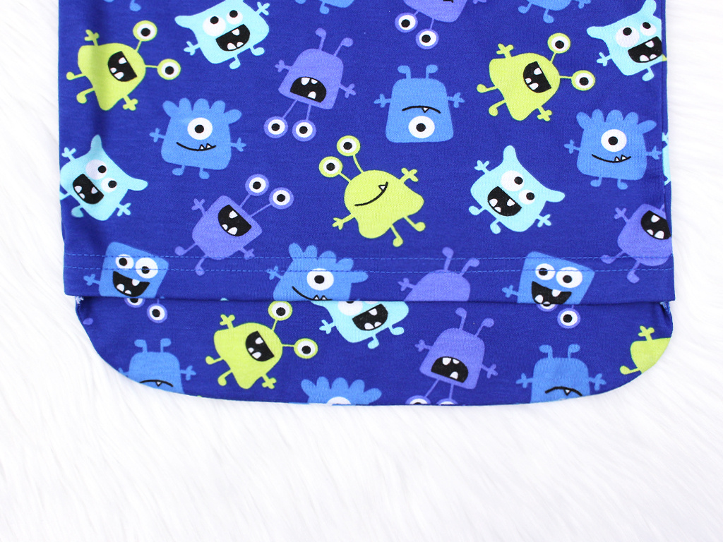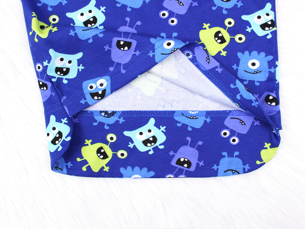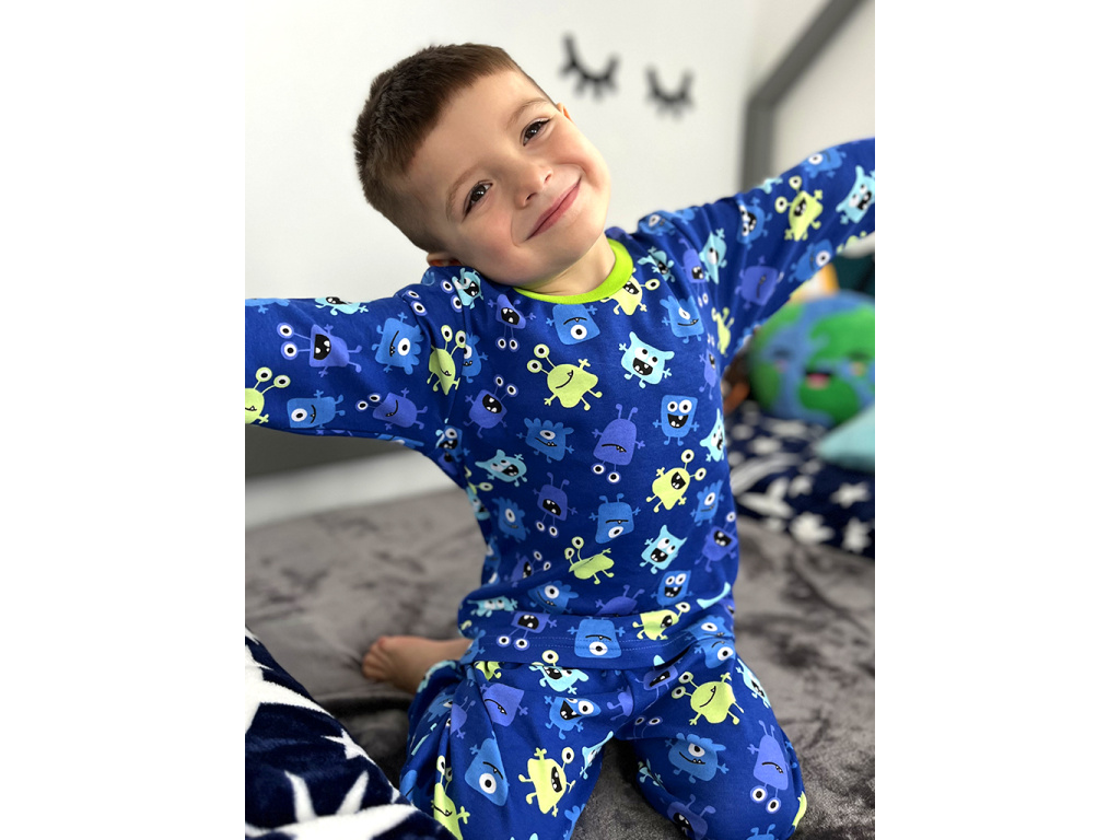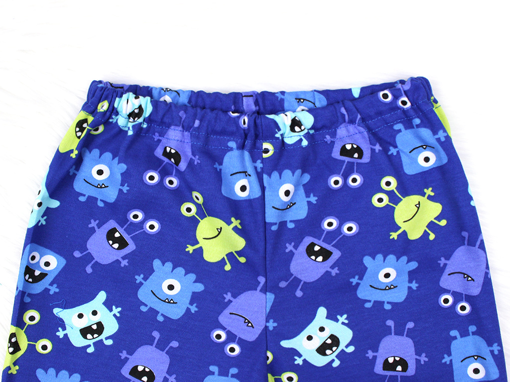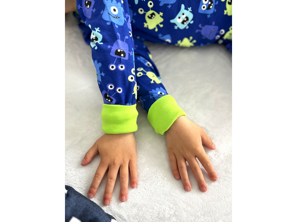 Bavlněné chlapecké pyžamo se vzorem příšerek na tmavě modrém podkladu je doplněno svítivě zeleným nápletem (95% bavlna, 5% elastan) u krku a jako zakončení rukávů a nohavic. Pyžamko je ušito z příjemného 100% bavlněného oboulícního úpletu.