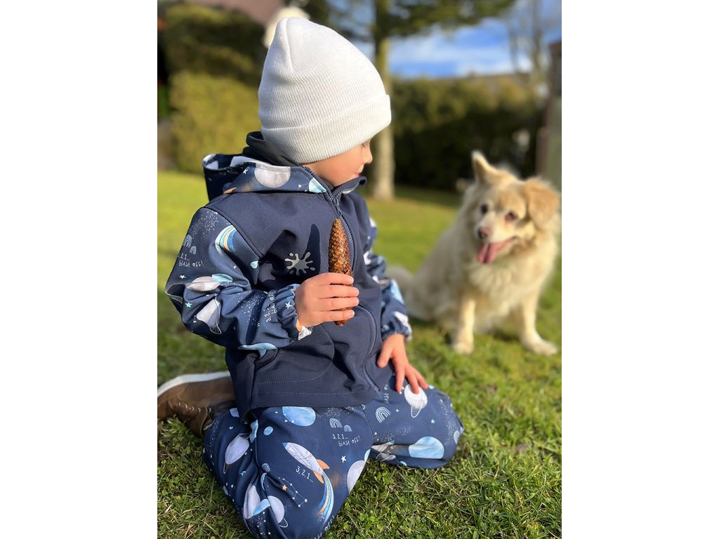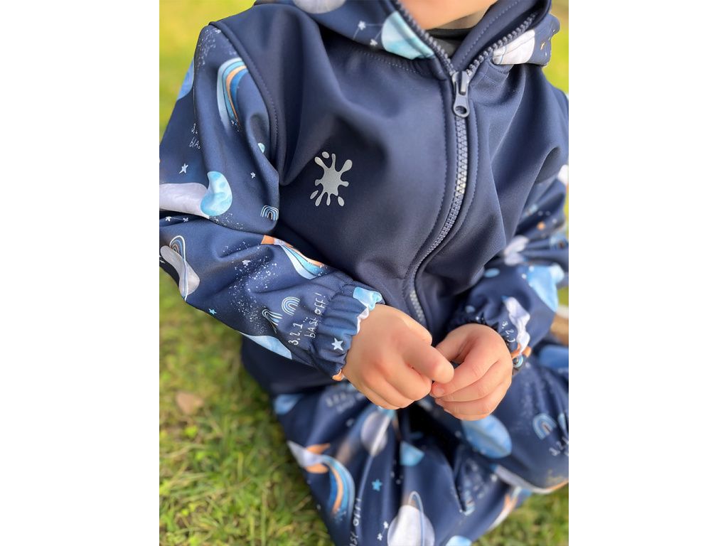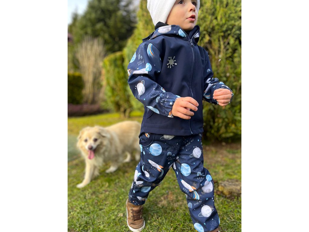 Materiál, který je ideální k venkovnímu dobrodružství. Nepromokne, neprofoukne, a proto je mezi maminkami a jejich dětmi tolik oblíbený. Skládá se ze tří vrstev - vrchní vrstvy, prodyšné membrány a vnitřní síťky, která je k látce přilepená. Vodní sloupec softshellu je 18 000 mm, prodyšnost 12 000 g/m2/24 hod. Tyto parametry jsou ideální na běžné volnočasové aktivity, jako je výlet do přírody, odpolední procházka nebo hraní na hřišti. Kalhoty jsou ušité z pružného softshellu.