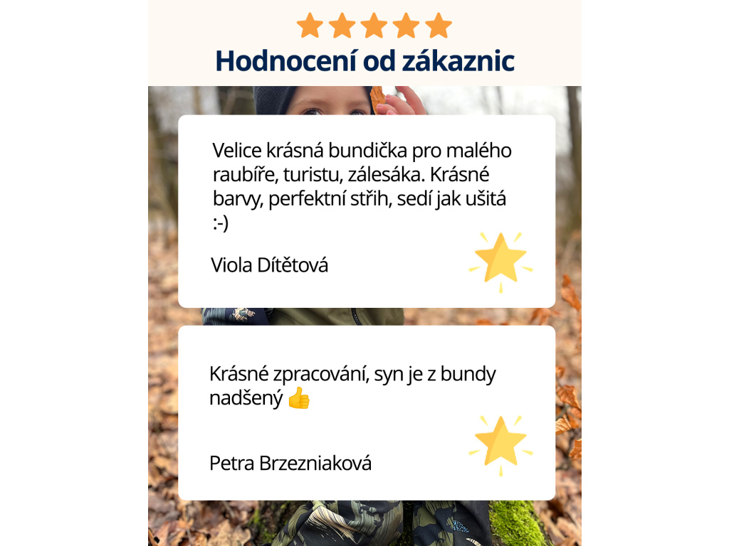 Velice krásná bundička pro malého raubíře, turistu, zálesáka. Krásné barvy, perfektní střih, sedí jak ušitá :-)