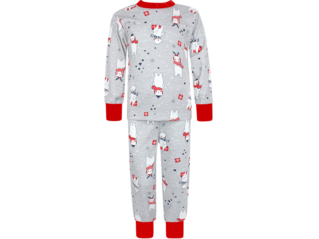 Bavlněné dětské vánoční pyžamo se vzorem medvídků na světle šedém podkladu je doplněno červeným nápletem (95% bavlna, 5% elastan) u krku a jako zakončení rukávů a nohavic. Pyžamko je ušito z příjemného 100% bavlněného oboulícního úpletu.