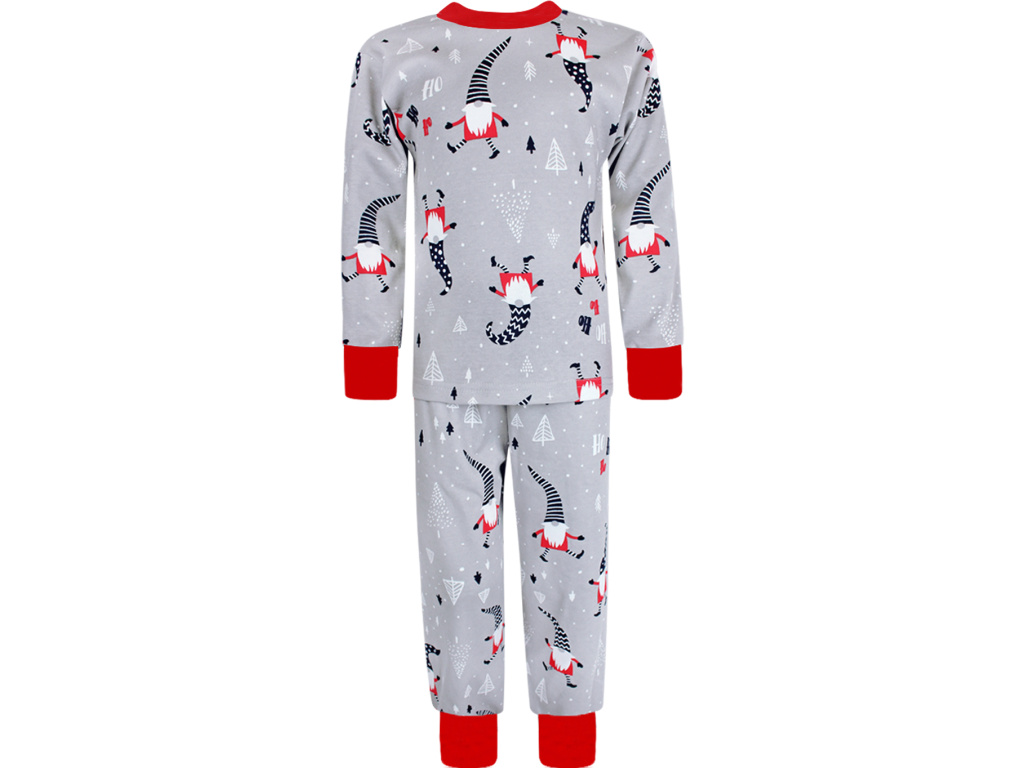Bavlněné dětské vánoční pyžamo se vzorem skřítků na světle šedém podkladu je doplněno červeným nápletem (95% bavlna, 5% elastan) u krku a jako zakončení rukávů a nohavic. Pyžamko je ušito z příjemného 100% bavlněného oboulícního úpletu.